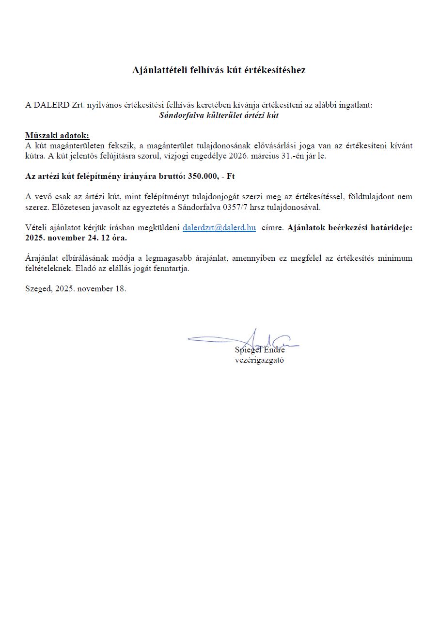 Ajánlattételi felhívás kút értékesítéshez Kovács László 2025.11.19. Egyéb kategória Bejegyzés navigáció Previous Previous post: Ajánlattételi felhívás gépjármű értékesítéshezNext Next post: Minden szem a COP30-ra és az EUDR kérdésre szegeződik