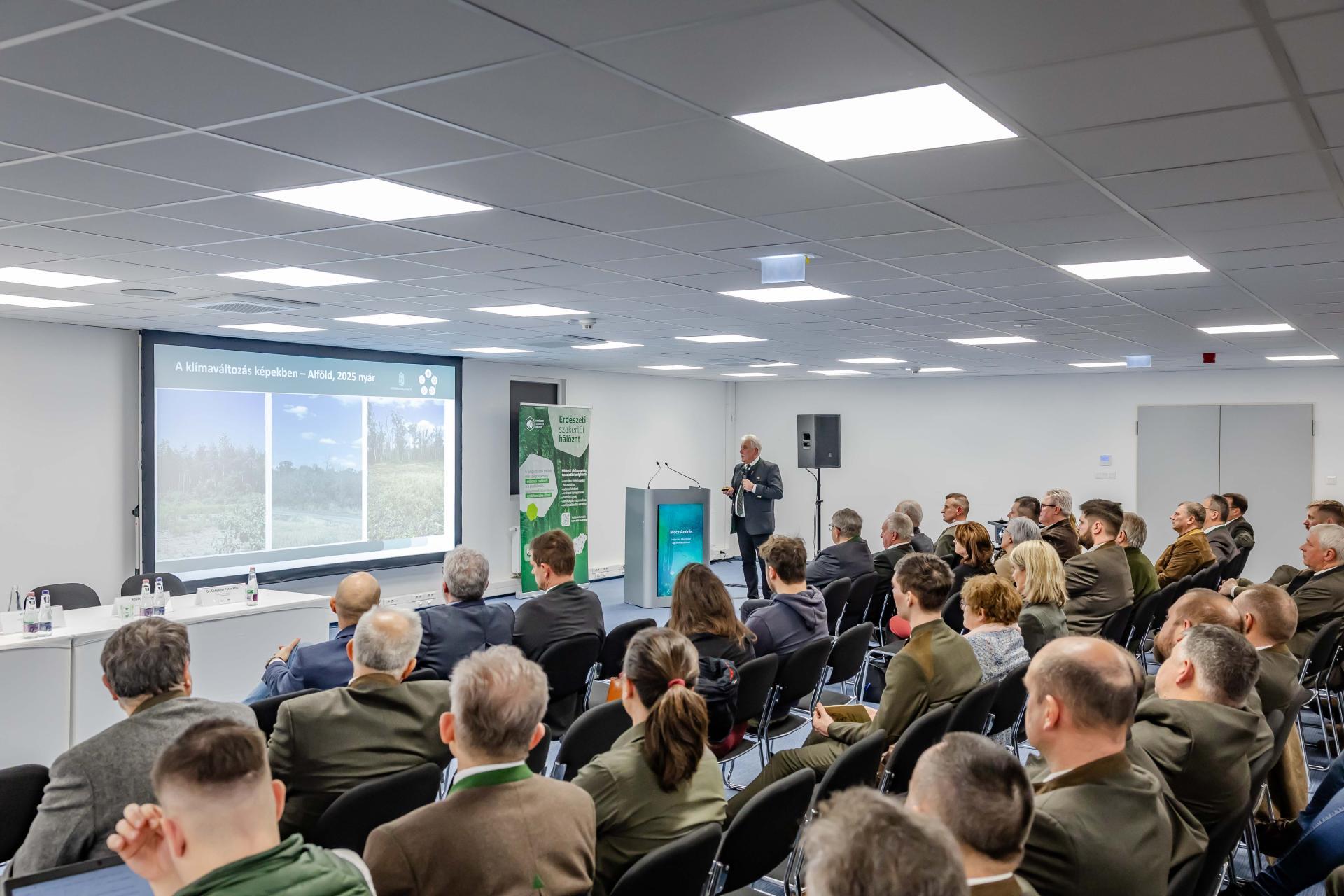 Mocz András kiemelte, az éghajlatváltozás jelentősen hat a termőhelyekre, sebessége százszorosa annak, mint amivel eddig a fafajaink találkoztak, az erdei ökoszisztémák természetes alkalmazkodási képessége nem képes ezt követni, különösen sérülékennyé téve az egyes erdei ökoszisztémákat. Az éghajlatváltozás jelenleg tapasztalt hatásai közül a legfontosabbak közt szerepel, az erdőtalajok vízháztartásának romlása, a csökkenő produktum, a növekvő erdőkárok, a csökkenő széntárolás és alkalmazkodó képesség mindezek hatásaként pedig a kevesebb minőségi feldolgozható faanyag. Hangsúlyozta, az új környezeti tényezők mellett új társadalmi igények is felmerülnek, olyan hangokkal is találkozunk, amelyek egész egyszerűen a gazdálkodást tartják magának a problémának. Ezért munkánk során kiemelt célunk, hogy a megfelelő szabályozás megteremtése a társadalmi elvárások figyelembe vételével történjen – tette hozzá a helyettes államtitkár.
